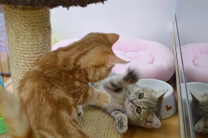 右のえいってやってるマンチカンと